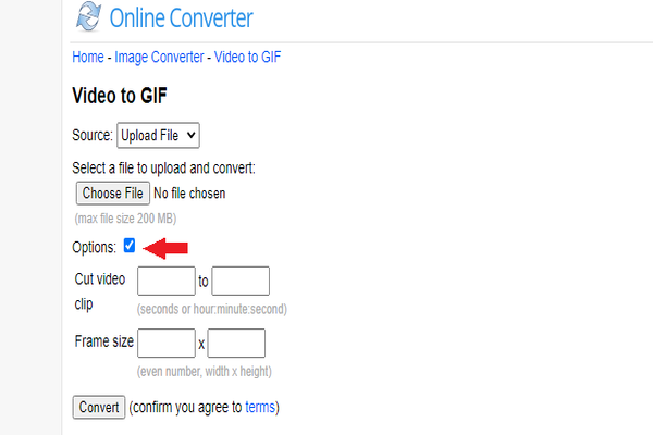 أيضا مسألة جميلة أنه بعد تحميل الفيديو يمكنك أيضا تحديد المقطع الزمني بتحديد لتحويله إلى صورة متحركة من خلال إختيارك لخيار Options, فقط ما سيحتاجه منك هو تحديد التوقيت الزمين للمشهد الدي تود تحويله.