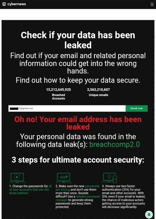 حسب الاحصائيات ، تتم عملية اختراق البيانات الشخصية من مواقع الويب كل يوم و يتم نشرها في منتديات أو أماكن مختلفة على الويب ، و غالبا ما ينتهي الأمر في عرض هذه المعلومات للبيع على الويب المظلم ليتم استخدامها في مجموعة من الجرائم الإلكترونية بما فيها سرقة الهوية و القيام بحملات الصيد الاحتيالية و البريد العشوائية ، و لتجنب الوقوع ضحية لهذه الأنواع من الجرائم ، يمكن التحقق مما إذا تم تسريب عنوان بريدك الإلكتروني عبر أداة CyberNews الأمنية .